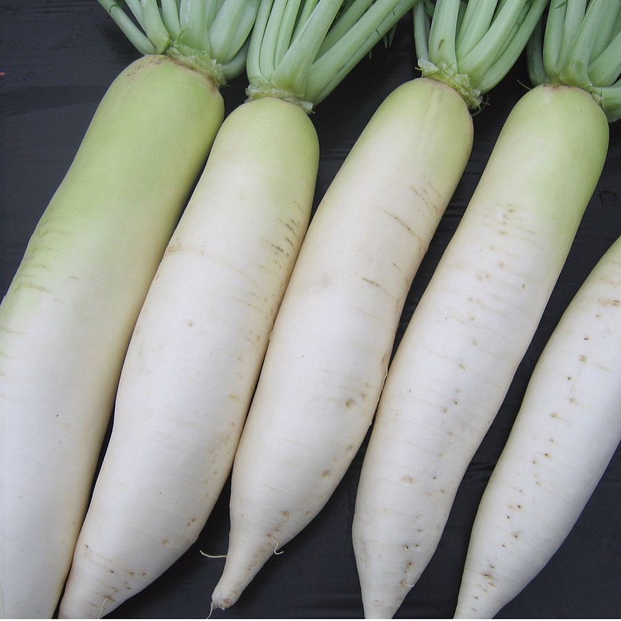 Семена дайкона Универсала F1 (Raphanus) высеиваются с марта по июль. Пониженные температуры не влияют на рост растения. Его главное универсальное качество – устойчивость к цветушности. Сам корнеплод довольно крупный и достигает 1,6 килограмм. В отличие от других видов, Универсал F1 отличается более сладкой, хрустящей и сочной мякотью. Интересно, что корнеплод делится на две части, различных по вкусовому восприятию. Подземная его половинка белого цвета напоминает в меру острый редис. А вторая, надземная имеет зеленый окрас и вкус свойственный маргеланской редьке. Селекционеры хотели добиться деликатесного, насыщенного вкуса и у них это отлично получилось.