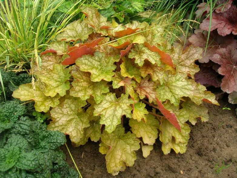 Рассада гейхеры Джинджер Але (Ginger Ale) отличается от других сортов необычной кремово-рыжей окраской, которая меняется на протяжении всего сезона. Молодые листья имеют оранжевый оттенок, который со временем темнеет, а на поверхности проступают темные прожилки. Рассада гейхеры Джинджер Але (Ginger Ale) незаменима при создании смешанных композиций, украшении миксбордеров и альпийских горок. Особенно эффектно смотрится во время цветения, когда появляются светлые желто-розовые цветочки. Этот многолетник неприхотлив, не боится болезней, не привлекает вредителей и не нуждается в укрытии на зиму.