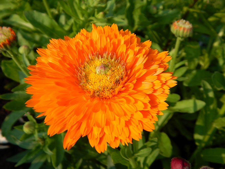 Семена календулы Зеленое сердце (Calendula officinalis) с виду напоминают большие крючки размером в 1 сантиметр. Густо облиственный раскидистый куст достигает 60 сантиметров в высоту. Стебель сильно ветвистый, листья многочисленные светло-зеленого цвета. Соцветия календулы Зеленое сердце имеют оригинальную окраску. Оранжевые махровые цветки с интересной зеленой сердцевинкой достигают 10 сантиметров в диаметре. Цветение продлится с середины лета до поздних заморозков. Однолетник изящно смотрится в группах, бордюрах и рабатках. Подходит для срезки. Растение находит широкое применение в медицинских целях. Высушенные цветки помогают в лечение пищеварительной, эндокринной, нервной системы.