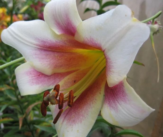 • Окраска цветка : кремово-белый со светло-желтым кантом, бордовыми пыльниками и мазками от центра