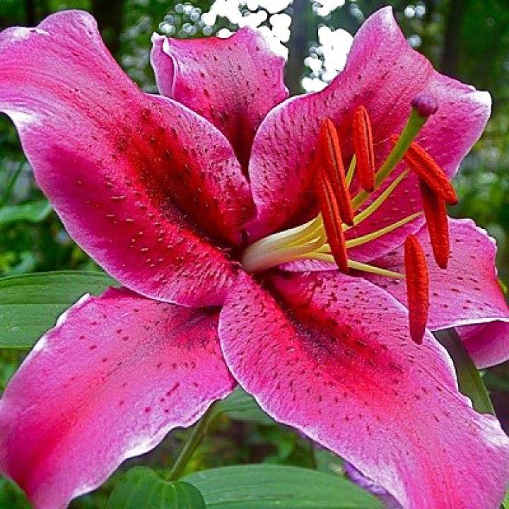 Саженцы и рассада Лилия восточная Барракуда (Lilium oriental Barracuda) украсят сад цветами во второй половине июня, июле. Высота стебля до 90 см, зелень спокойная матовая. Растение отличается необычной формой и окраской цветка. Очень крупные, до 22 см в диаметре, цветки имеют всего 6 лепестков. Форма лепестка широкая у основания с зауженными концами, края волнистые, слегка загнутые от центра. Цвет насыщенный яркий пурпурно-розовый с желтовато-белой окантовкой края. Весь лепесток покрыт темно-красными точками крапа и до середины мелкими выростами-сосочками совпадающими по цвету.