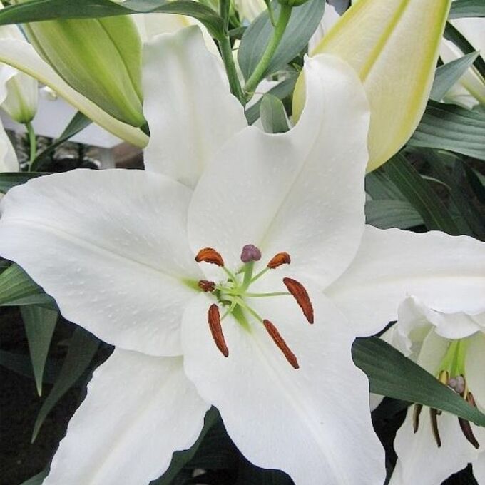 Луковицы лилии восточной горшечной Тру Эмоушн (Lilium True Emotion) — это яркая экзотика для украшения клумб и придомовых участков. Кусты этого сорта пышные, с прочными стеблями, особенно ценятся за устойчивость к заморозкам. Также они редко подвергаются воздействию инфекционных заболеваний и вредителей. Главное украшение лилии — это ее цветы, которые в конце лета начинают распускаться в большом количестве. Лепестки этого сорта классического белого цвета, с контрастными темными пыльниками. Они достигают 16 см в диаметре и появляются на цветоносах целыми букетами. Благодаря обильному цветению лилия Тру Эмоушн подходит не только для групповых, но и для одиночных посадок.