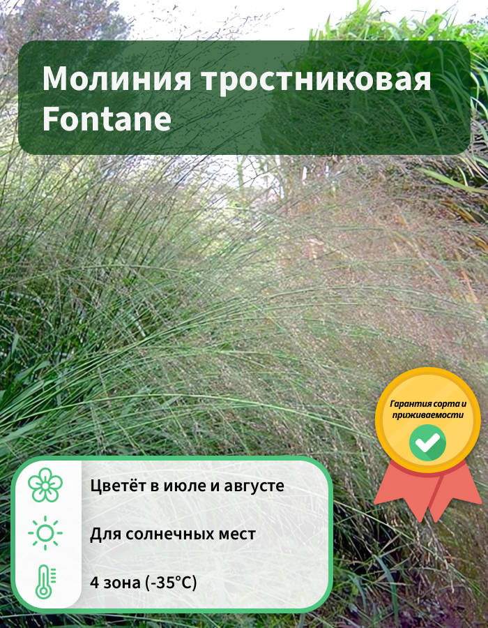 Рассада молинии тростниковой Фонтан (Fontane) обладает невзрачными соцветиями коричневого цвета, которые придают естественность искусственным водоёмам, создавая эффект лёгкой заболоченности. Фонтаном его принято называть из-за цветоносов, которые растут не прямо вверх, а в разные стороны. Иногда они достигают почти полутора метров в высоту, поэтому служат отличным фоном для сада, разбавляя яркие краски других цветов. Достоинством рассады считается неприхотливость и зимостойкость. Характеристика сорта Фонтан (Fontane):